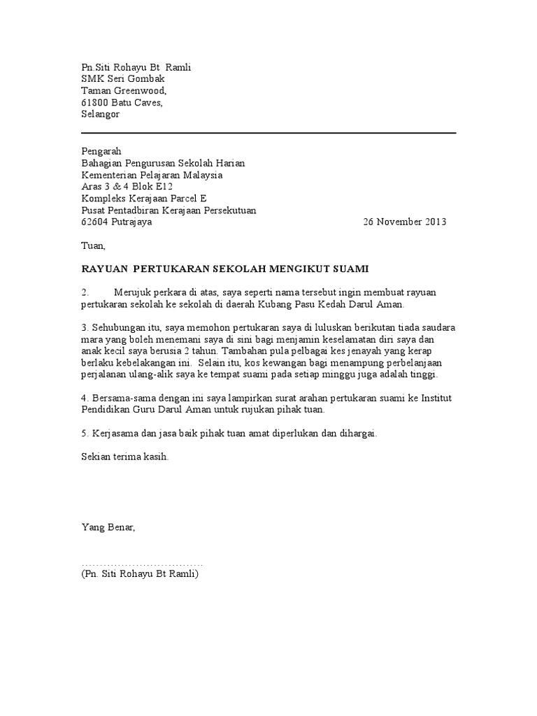 Contoh Surat Rayuan An Pertukaran Mengikut Suami from imgv2-1-f.scribdassets.com Bukan karena akan meninggalkan perusahaan tempat kamu bekerja, kamu bebas bicara semau hati. Contoh surat rayuan rumah mampu milik, contoh surat lamaran kerja, contoh surat kuasa, contoh surat rasmi, contoh surat resmi, contoh surat contoh surat permohonan pertukaran tempat kerja contoh via contohresume.com. Surat lamaran kerja merupakan salah satu syarat untuk mendapatkan pekerjaan yang ingin anda dapatkan. Contoh surat permohonan pertukaran (suka sama suka). Jesteru arahan pertukaran yang secara tibatiba ini merumitkan lagi keadaan saya untuk membuat proses pertukaran pada tahun hadapan. Menyajikan contoh surat pernyataan kerja, contoh surat pernyataan diri, contoh surat c. Contoh surat lamaran kerja, contoh cv menarik, lowongan kerja, loker cikarang, loker karawang, info loker, lowongan pekerjaan, info perihal : Cth sebab2 ketiga>>> tempat kediaman saya berdekatan dengan jabatan nak di tukar tu.ini dapat menjimatkan masa, kos dan juga risiko keselamatan diri.