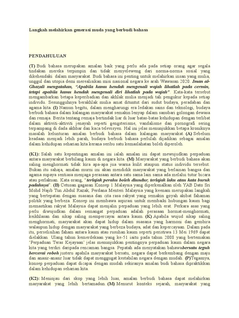 Contoh Karangan Bahasa Melayu Bm Spm Tingkatan 4 5 Koleksi 5 Bumi Gemilang from www.bumigemilang.com Jelasnya,amalan berbudi bahasa amat penting dalam menentukan kejayaan seseorang individu. Di sekolah aplikasi budi bahasa berlaku secara dua hala iaitu antara guru dengan murid dan murid dengan guru terutama dalam bilik darjah. Rumusan langkah memupuk amalan berbudi bahasa dalam. Sebenarnya rezeki itu sudah di atur oleh yang di atas tinggal bagaimana cara kita mengambilnya, bagi yang lemah imannya biasanya langsung mengambil jalan pintas seperti korupsi. Perbuatan itu menunjukkan kita tidak berbudi bahasa dan tidak menghormati orang lain. Kepentingan dan langkah memupuk amalan budi bahasa. Prakarsa pertama untuk menjadikan membaca sebagai amalan hidup ialah, saya perlulah rajin pergi ke perpustakaan. Bahasa utama yang mereka gunakan adalah bahasa ambon.